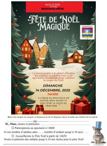 La commune a le plaisir d’inviter tous les enfants au traditionnel spectacle de Noël, qui aura lieu cette année le dimanche 14 décembre 2025 à 14H00, à la Salle des Fêtes de Soissons-sur-Nacey.