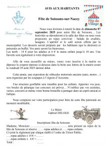 Avis aux habitants et fête de Soissons D. B. Les avis aux habitants du mois d’août 2025 et de la fête de Soissons-sur-Nacey le dimanche 7 septembre 2025 sont parus, vous pouvez les télécharger ci-dessous, pensez à vous inscrire avant le vendredi 29 août.